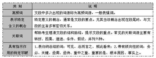 1.关键词——题干材料中的关键词主要有:高频词、表示特定含义的概念、关联词和具有指示作用的特定字眼。