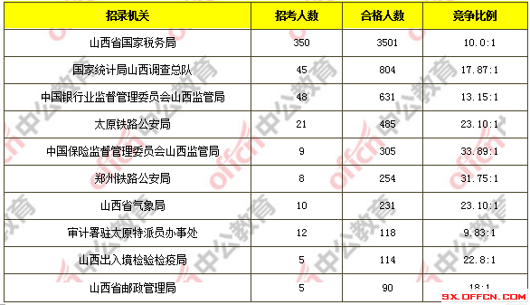 为帮助广大考生更清晰的了解今日报名情况,山西中公教育整理了审核通过人数前十位的部门以及竞争比例最激烈的十大部门,供广大考生参考: