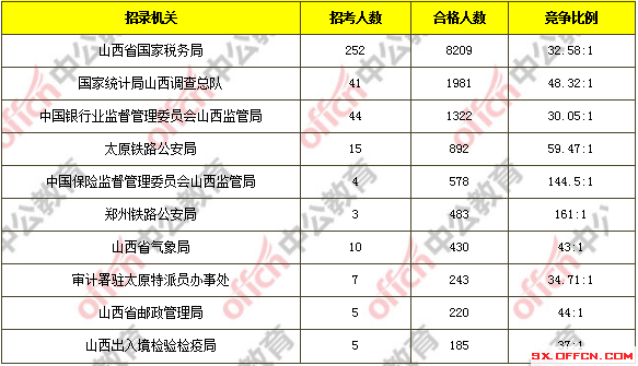 截至11月6日16时,据山西中公教育统计,国考职位中工作地点在山西的职位通过审核总人数为14854人,和昨天相比增加了3236人,与去年同期相比合格人数减少了4624人,截止目前共有8个职位无人报考,平均竞争比例为27.97:1,和去年同期竞争比下降了1.50%。