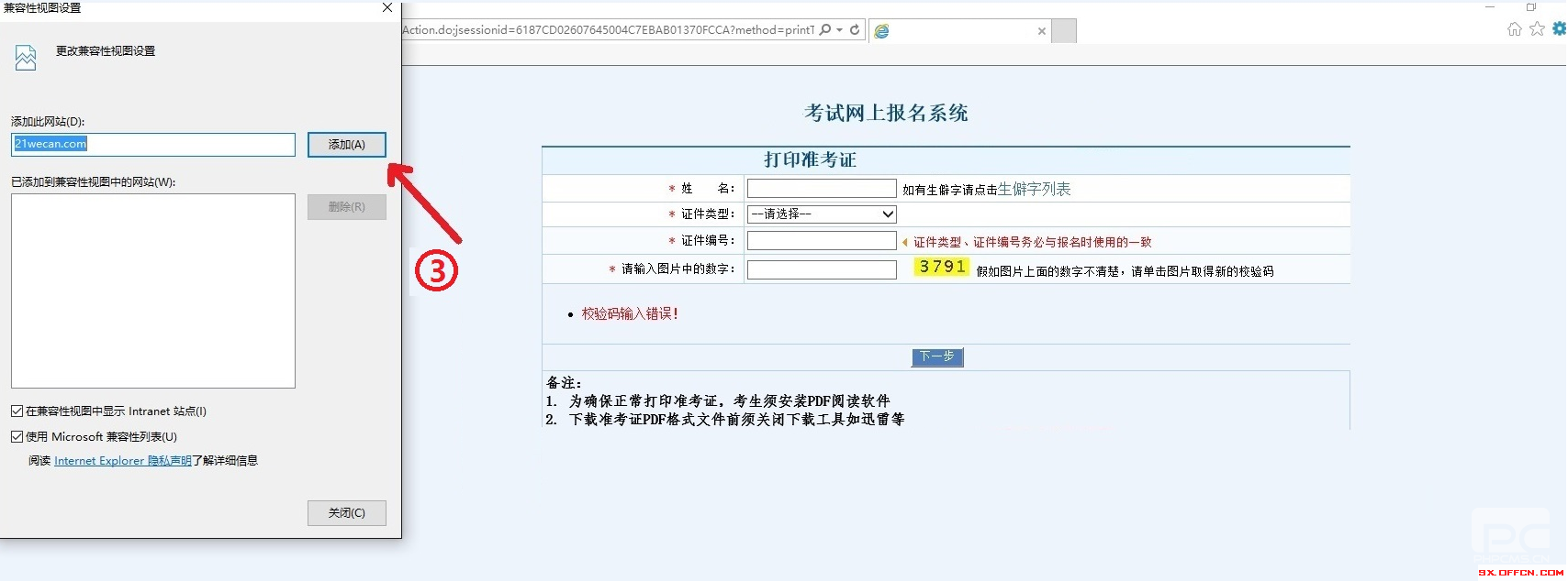 4.确认”21wecan.com”出现在”已添加到兼容性视图中的网站”下的方框中,同时确认如下图的两个勾选项,点击”关闭”即可进行打印准考证操作。